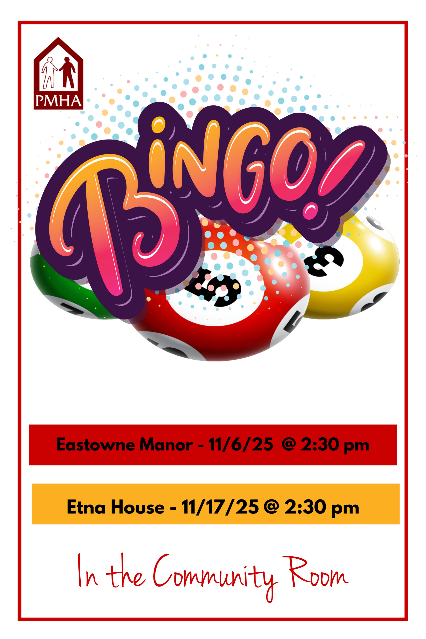 Bingo at Etna House + Add to Google Calendar + iCal / Outlook export 00 days 00 hours 00 minutes 00 seconds Date Nov 17 2025 Time 2:30 pm - 3:30 pm Location Etna House community room Share this event Search for: Recent Posts Important Funding Announcement PMHA Public Hearing Notice Blooming on the Lawn PMHA Section 8 Waiting List Closing Kent Roosevelt Rough Riders join PMHA Kids Summer Camps