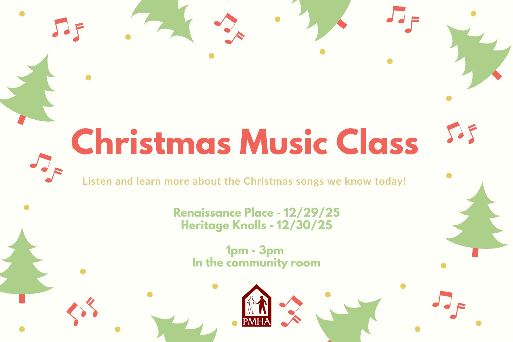 Christmas Music Class – Renaissance Place + Add to Google Calendar + iCal / Outlook export The event is finished. Date Dec 29 2025 Expired! Time 1:00 pm - 3:00 pm Location Renaissance Place Community Room 5650 S. Prospect St., Ravenna Share this event Search for: Recent Posts 2026 Board Meeting Schedule King Kennedy and Skeels Children’s Christmas Party PMHA Public Hearing Notice Blooming on the Lawn PMHA Section 8 Waiting List Closing