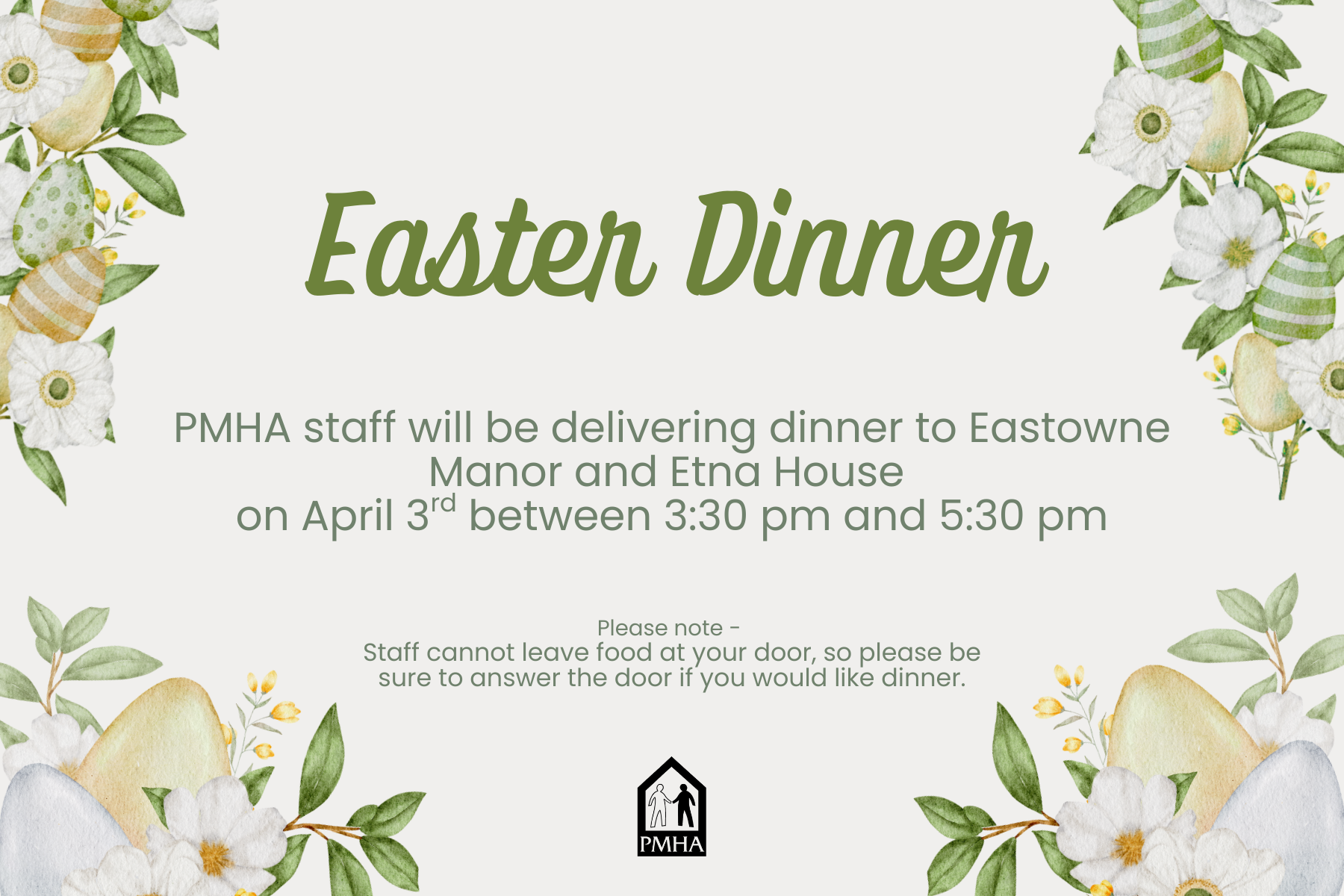 Easter Dinner – Eastowne Manor and Etna House + Add to Google Calendar + iCal / Outlook export 00 days 00 hours 00 minutes 00 seconds Date Apr 03 2026 Time 3:30 pm - 5:30 pm Location Eastowne Manor Other Locations Etna House Share this event Search for: Recent Posts Hometown Bank Scouting for Fraud Workshop 2026 Board Meeting Schedule PMHA Public Hearing Notice PMHA Section 8 Waiting List Closing Kent Roosevelt Rough Riders join PMHA Kids Summer Camps