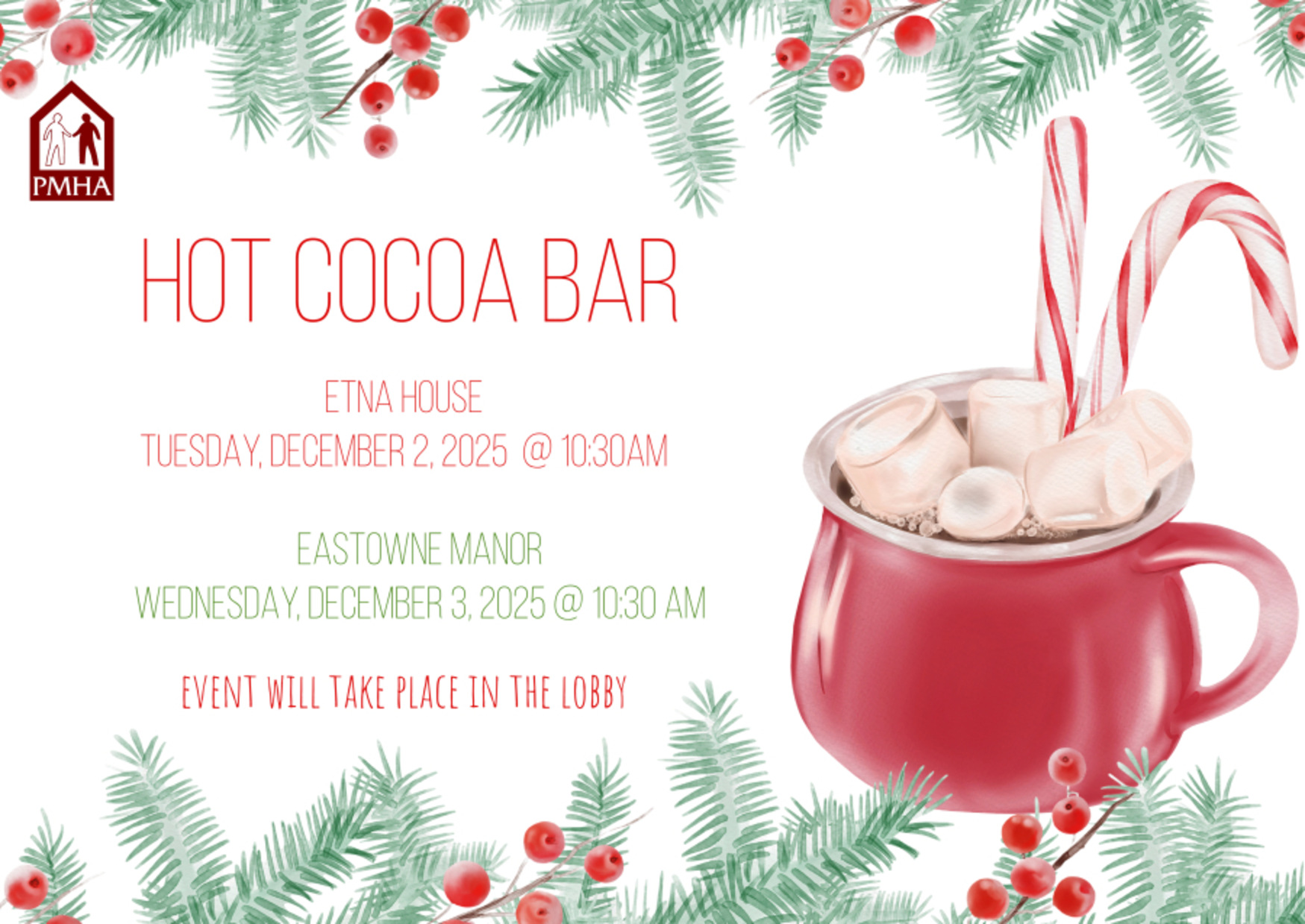 Hot Cocoa Bar for Eastowne Manor Residents + Add to Google Calendar + iCal / Outlook export 00 days 00 hours 00 minutes 00 seconds Date Dec 03 2025 Time 10:30 am - 11:30 am Location Eastowne Manor lobby Share this event Search for: Recent Posts Important Funding Announcement PMHA Public Hearing Notice Blooming on the Lawn PMHA Section 8 Waiting List Closing Kent Roosevelt Rough Riders join PMHA Kids Summer Camps