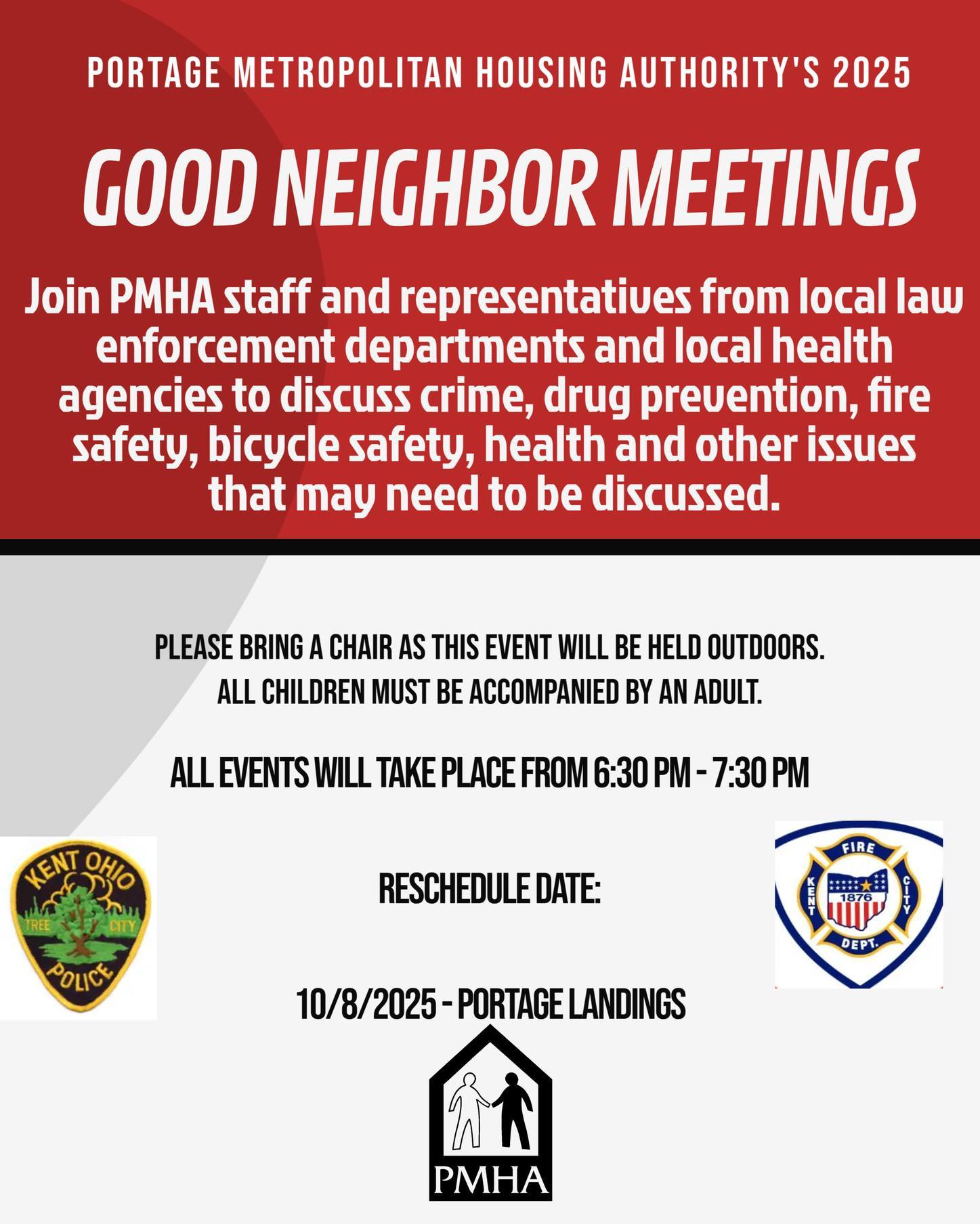 Good Neighbor Meeting – Portage Landings (New Date!) + Add to Google Calendar + iCal / Outlook export The event is finished. Date Oct 08 2025 Expired! Time 6:30 pm - 7:30 pm Location Portage Landings Category Featured Share this event Search for: Recent Posts 2026 Board Meeting Schedule King Kennedy and Skeels Children’s Christmas Party PMHA Public Hearing Notice Blooming on the Lawn PMHA Section 8 Waiting List Closing
