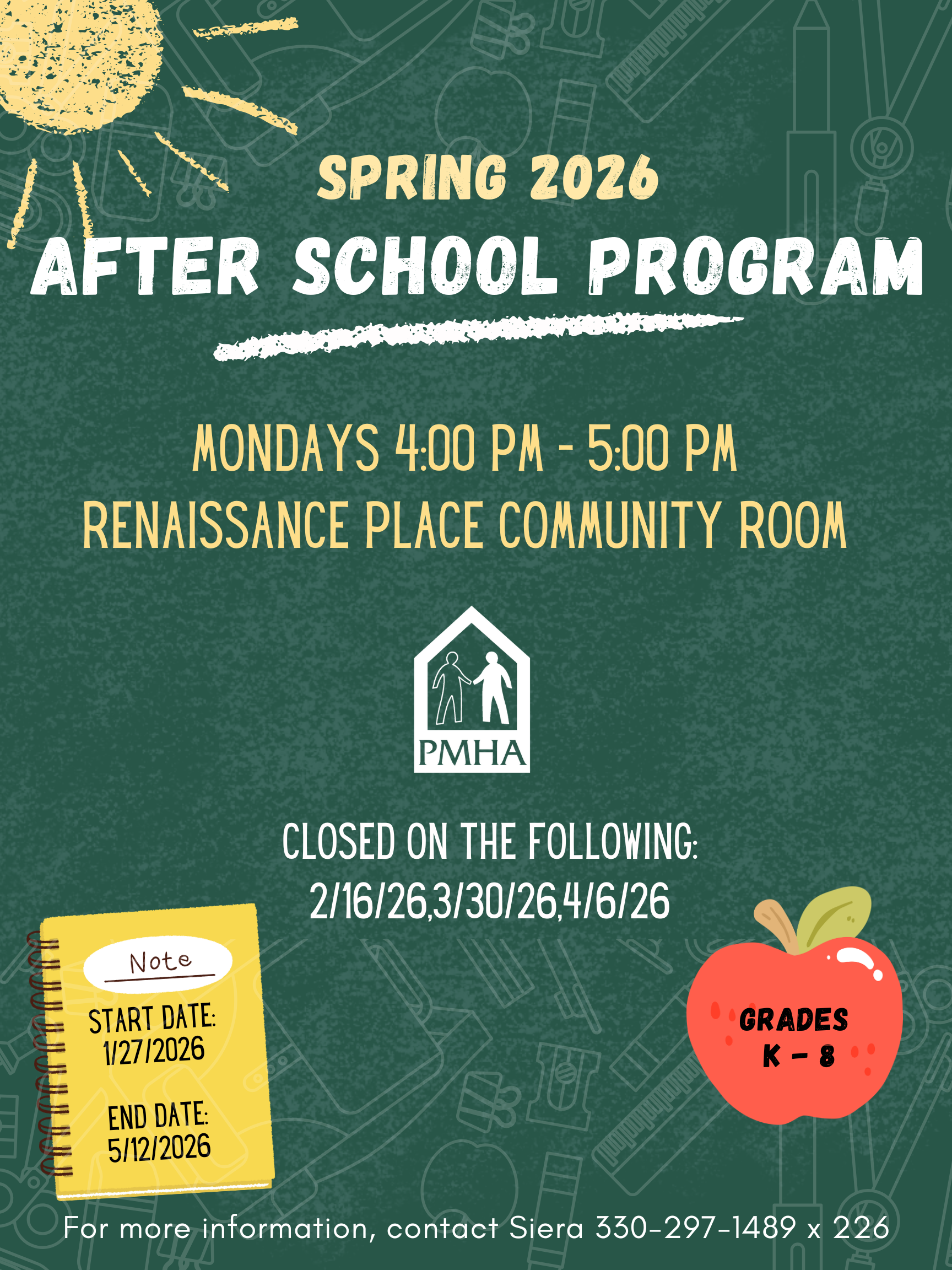 After School Program **CLOSED on the following days: February 16th, March 30th, and April 6th** + Add to Google Calendar + iCal / Outlook export 00 days 00 hours 00 minutes 00 seconds Date Jan 27 2026 Time 4:00 pm - 5:00 pm Location Renaissance Place Community Room 5650 S. Prospect St., Ravenna Share this event Search for: Recent Posts King Kennedy and Skeels Children’s Christmas Party PMHA Public Hearing Notice PMHA Public Hearing Notice Blooming on the Lawn PMHA Section 8 Waiting List Closing