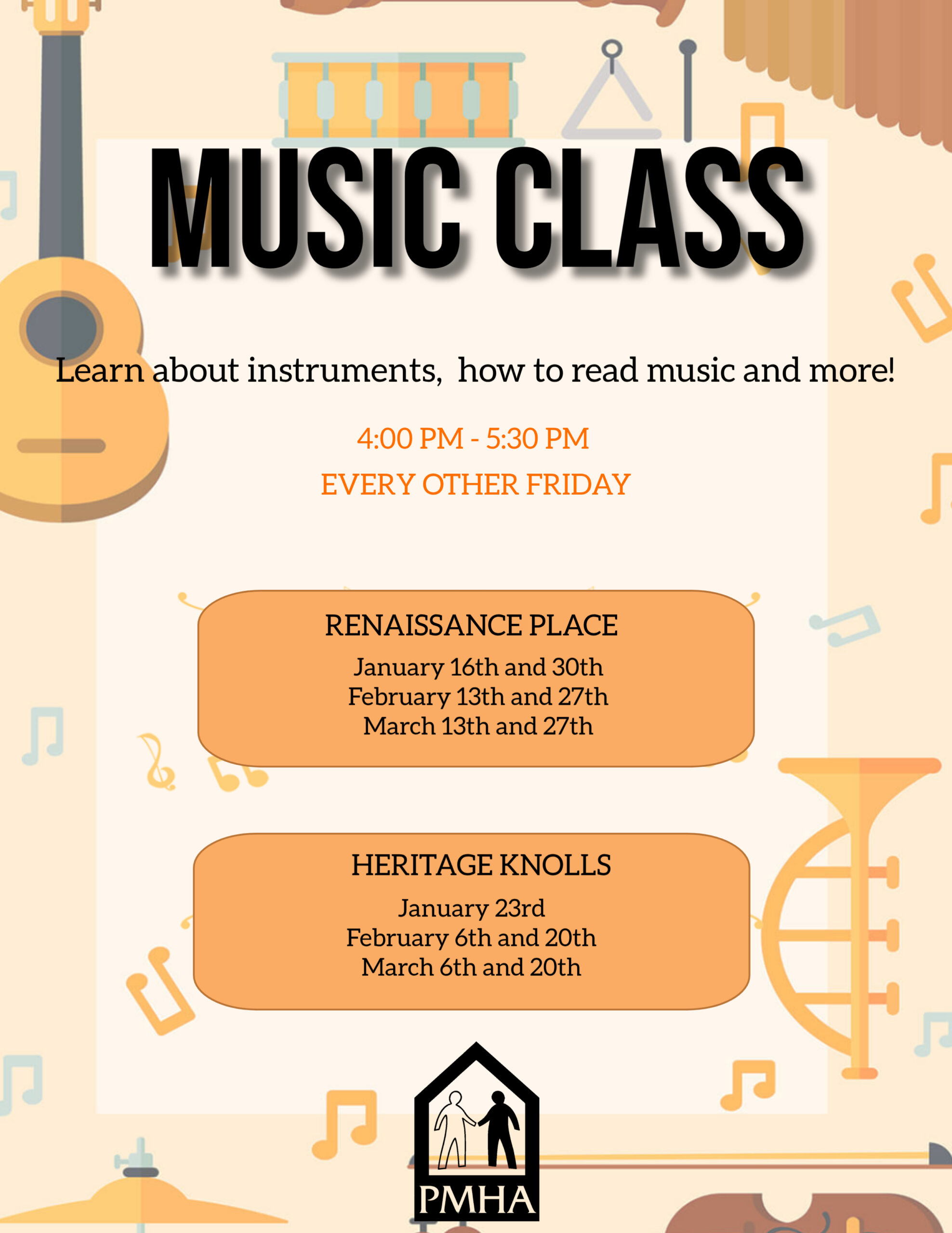 Music Class at Renaissance Place + Add to Google Calendar + iCal / Outlook export 00 days 00 hours 00 minutes 00 seconds Date Jan 30 2026 Time 4:00 pm - 5:30 pm Location Renaissance Place Community Room 5650 S. Prospect St., Ravenna Share this event Search for: Recent Posts 2026 Board Meeting Schedule King Kennedy and Skeels Children’s Christmas Party PMHA Public Hearing Notice Blooming on the Lawn PMHA Section 8 Waiting List Closing