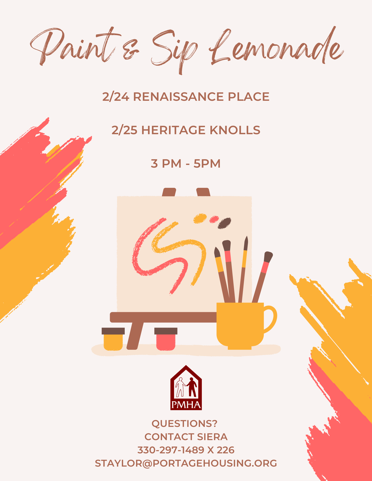 Paint & Sip Lemonade – Heritage Knolls + Add to Google Calendar + iCal / Outlook export The event is finished. Date Feb 25 2026 Expired! Time 3:00 pm - 5:00 pm Location Heritage Knolls community room Share this event Search for: Recent Posts Hometown Bank Scouting for Fraud Workshop 2026 Board Meeting Schedule PMHA Public Hearing Notice PMHA Section 8 Waiting List Closing Kent Roosevelt Rough Riders join PMHA Kids Summer Camps