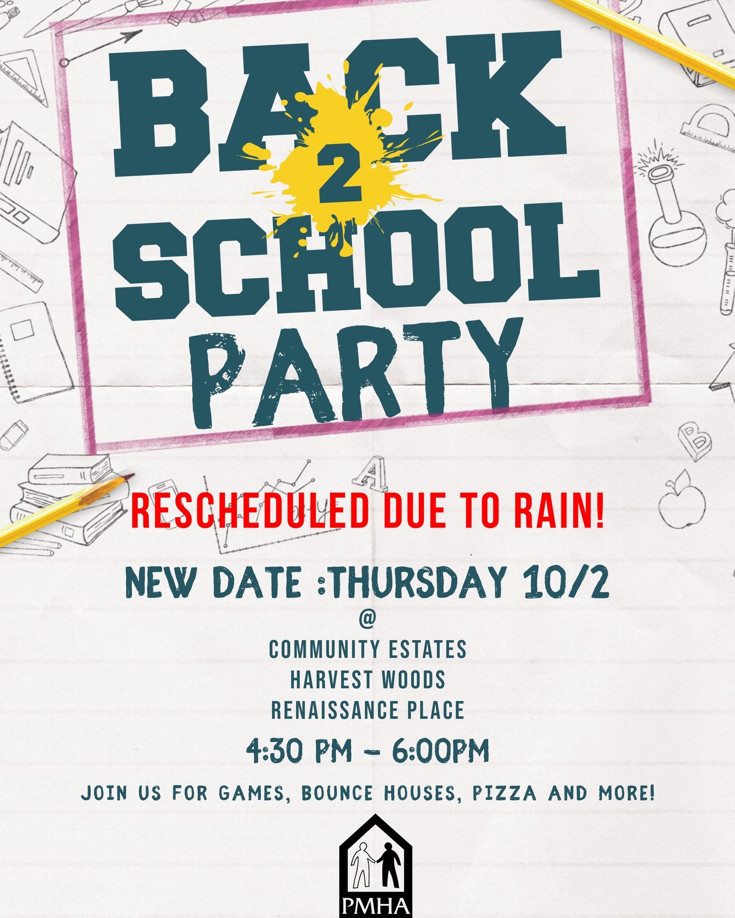 PMHA Back 2 School Party at Community Estates, Harvest Woods, & Renaissance Place (New Date!) + Add to Google Calendar + iCal / Outlook export The event is finished. Date Oct 02 2025 Expired! Time 4:30 pm - 6:00 pm Location Community Estates (picnic pavilion) Other Locations Harvest Woods Renaissance Place Category Featured Share this event Search for: Recent Posts 2026 Board Meeting Schedule King Kennedy and Skeels Children’s Christmas Party PMHA Public Hearing Notice Blooming on the Lawn PMHA Section 8 Waiting List Closing