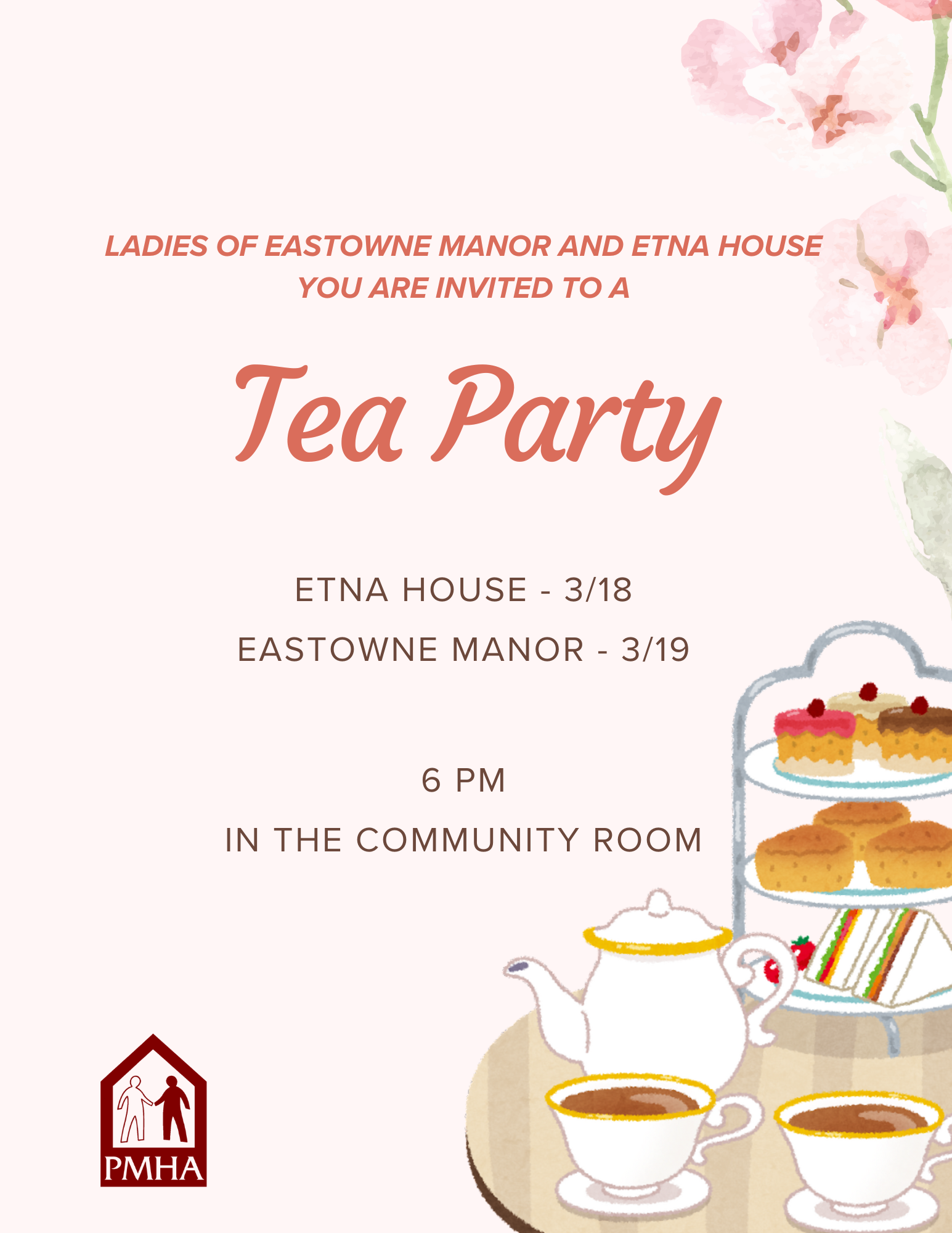 Tea Party at Etna House + Add to Google Calendar + iCal / Outlook export 00 days 00 hours 00 minutes 00 seconds Date Mar 18 2026 Time 6:00 pm - 7:00 pm Location Etna House community room Share this event Search for: Recent Posts Hometown Bank Scouting for Fraud Workshop 2026 Board Meeting Schedule PMHA Public Hearing Notice PMHA Section 8 Waiting List Closing Kent Roosevelt Rough Riders join PMHA Kids Summer Camps